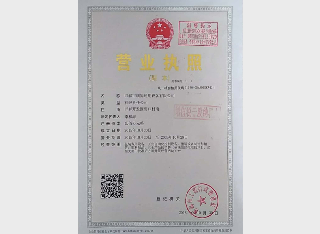邯鄲市瑞冠智能化裝備有限公司辦公室地址位于具有1萬年的歷史和3100年的建城史的邯鄲,邯鄲 邯鄲開發(fā)區(qū)賈口村南,于2015-10-30 在邯鄲工商局注冊成立,注冊資本為200萬人民幣(萬元),公司已經(jīng)公司發(fā)展壯大的5年,愿與社會各界同仁攜手合作,謀求共同發(fā)展,繼續(xù)為新老客戶提供優(yōu)秀的產(chǎn)品和服務。我公司主要經(jīng)營包裝專用設備、工業(yè)自動化控制設備、搬運設備制造與銷售;塑料制品、五金產(chǎn)品的銷售(依法須經(jīng)批準的項目,經(jīng)相關部門批準后方可開展經(jīng)營活動),我公司與多家邯鄲零售商和代理商建立了長期穩(wěn)定的合作關系,品種齊全、價格合理,企業(yè)實力雄厚,重信用、守合同、保證產(chǎn)品質(zhì)量,以多品種經(jīng)營特色和薄利多銷的原則,…